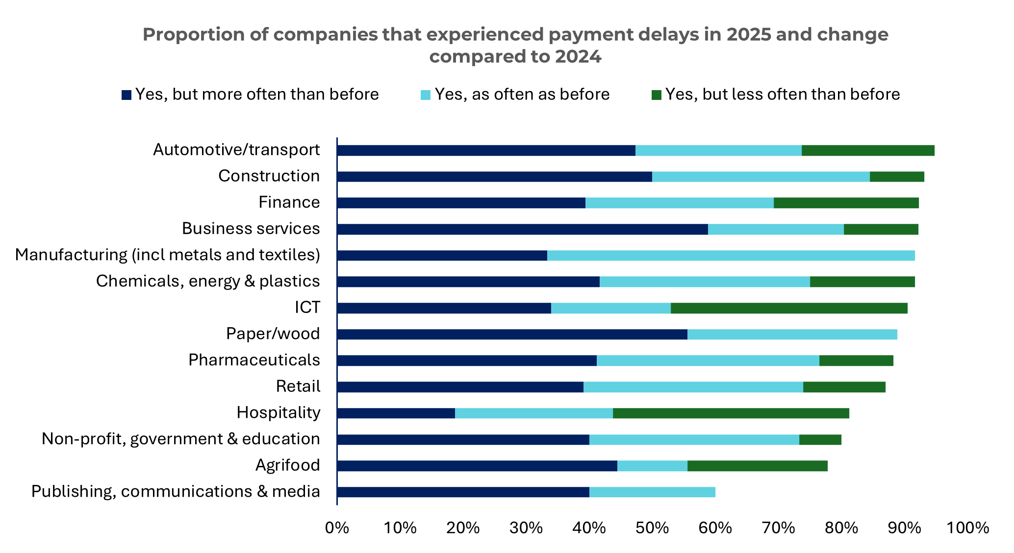 Construction and automotive/transportare the most affected by rising payment delays (95% and 93%, respectively), while publishing, communications & media (60%), agrifood (78%), and non-profit, government & education (78%), report fewer issues. This is often thanks to longer payment terms or stronger buyer discipline.