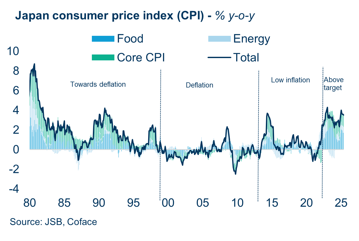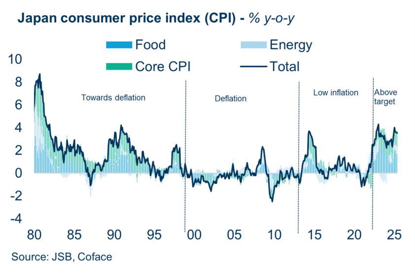 Over the past three decades, occasional inflationary episodes occurred, mostly driven by temporary shocks such as oil price spikes or consumption tax hikes, without lasting pull from domestic demand. This has changed since 2022, when inflation consistently exceeded the Bank of Japan’s 2% target, fuelled initially by rising import costs and yen depreciation.